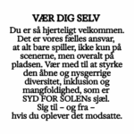 Vi insisterer på – og håndhæver – at SYD FOR SOLEN som festival og som organisation og arbejdsplads, skal være et trygt og omsorgsfuldt sted for alle. Derfor har vi klare og bredt kommunikerede principper for hvad vi ser som sund og acceptabel adfærd på festivalen for vores gæster, vores samarbejdspartnere og for vores medarbejdere og mange frivillige.